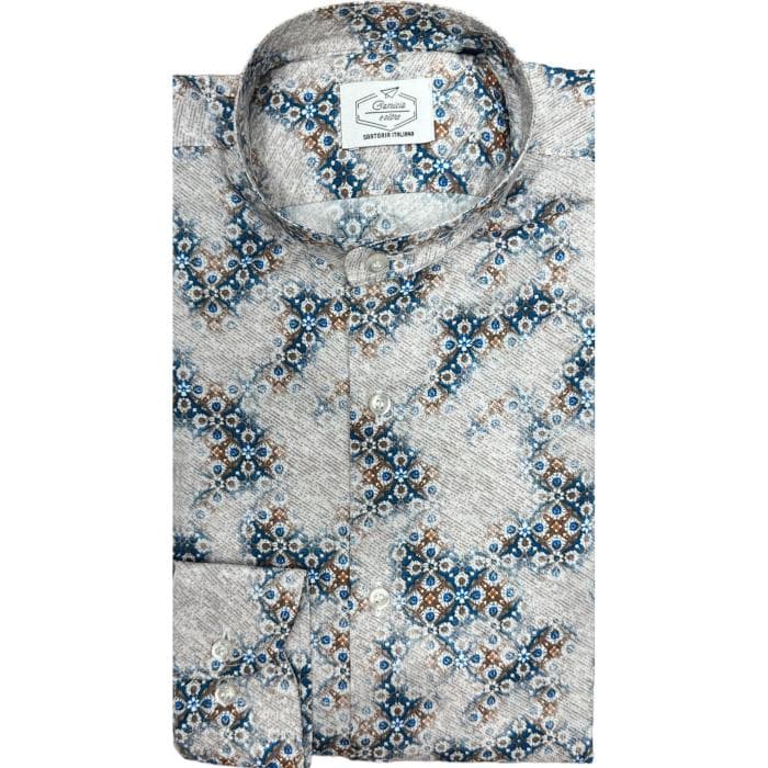 Camicia da uomo in puro cotone dalla vestibilità morbida e leggera. Caratterizzata da una stampa caleidoscopica All Over, nei toni del blu e del marrone su sfondo chiaro. Colletto alla Francese, realizzato a mano e rinforzato con stecche e manica lunga con doppia finta.