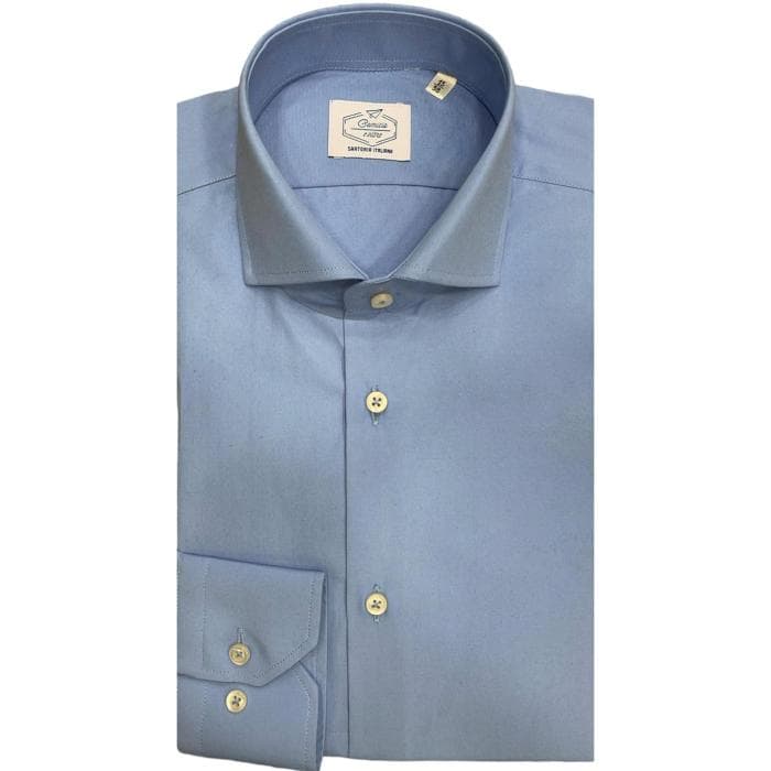 Camicia da uomo tinta unita Celeste scuro, realizzata in cotone 100%. Un capo artigianale per dare un tocco di eleganza ai tuoi look quotidiani. Colletto alla Francese. Manica lunga. Vestibilità Slim/Regular.