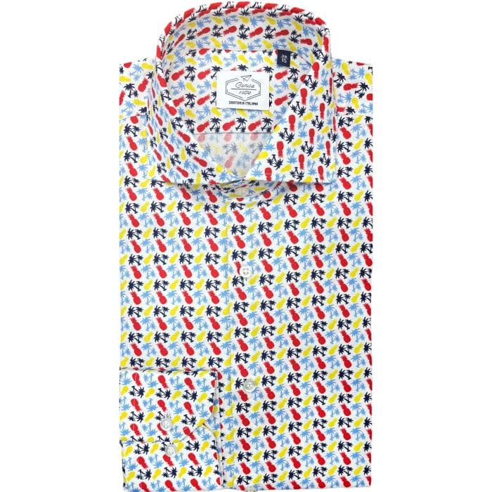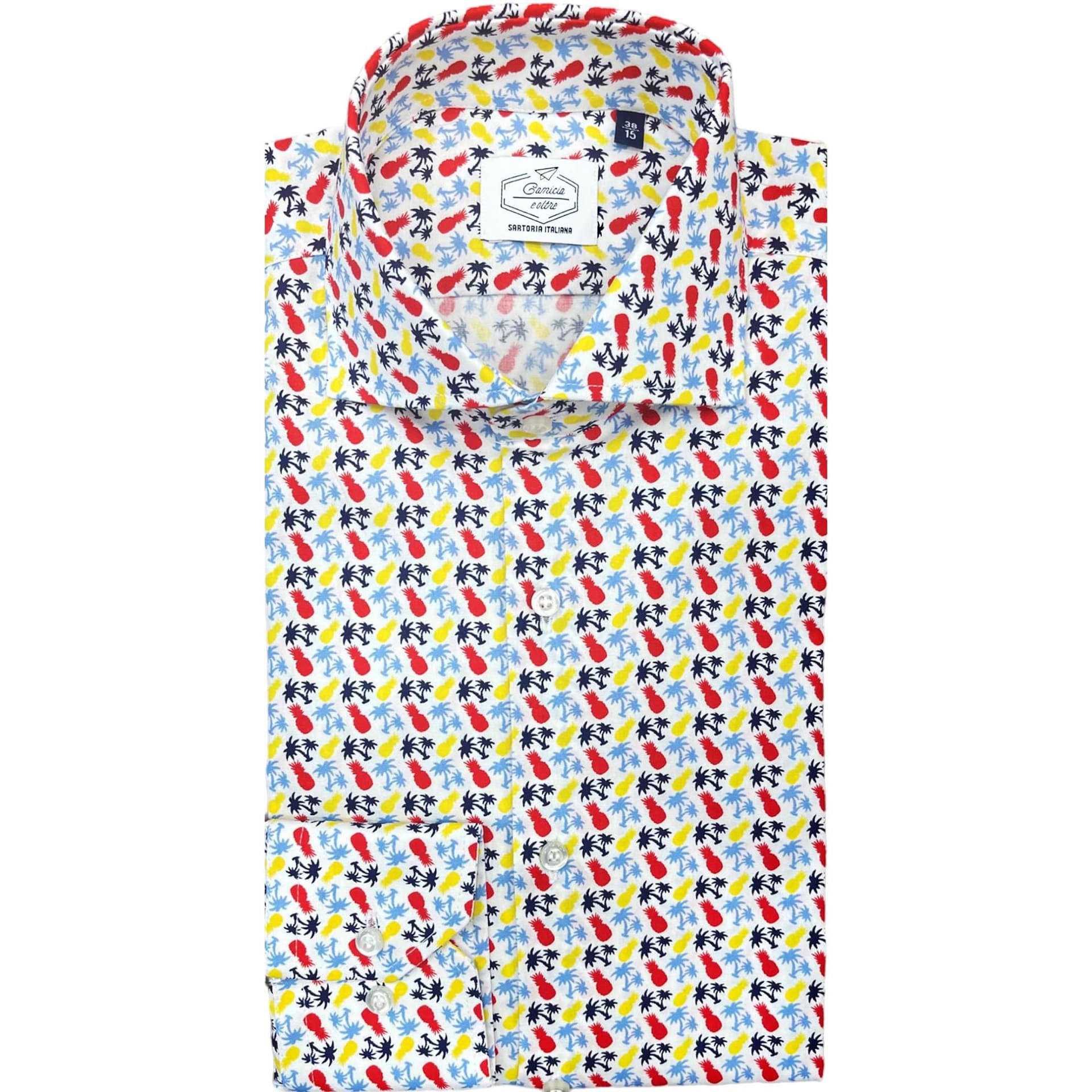 Nuova collezione estiva firmata Camicia e Oltre. Fresca camicia uomo con colorata fantasia estiva, in puro cotone. Colletto alla Francese realizzato a mano. Vestibilità Slim/Regular. Manica lunga.