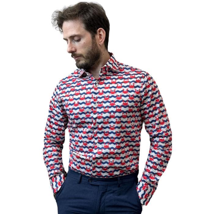 Crea i tuoi look estivi con la nuova collezione firmata Camicia e Oltre! Camicia uomo a manica lunga, con simpatica fantasia estiva bianca, blu e rossa. Realizzata in cotone puro. Colletto alla Francese. Vestibilità Slim/Regular.