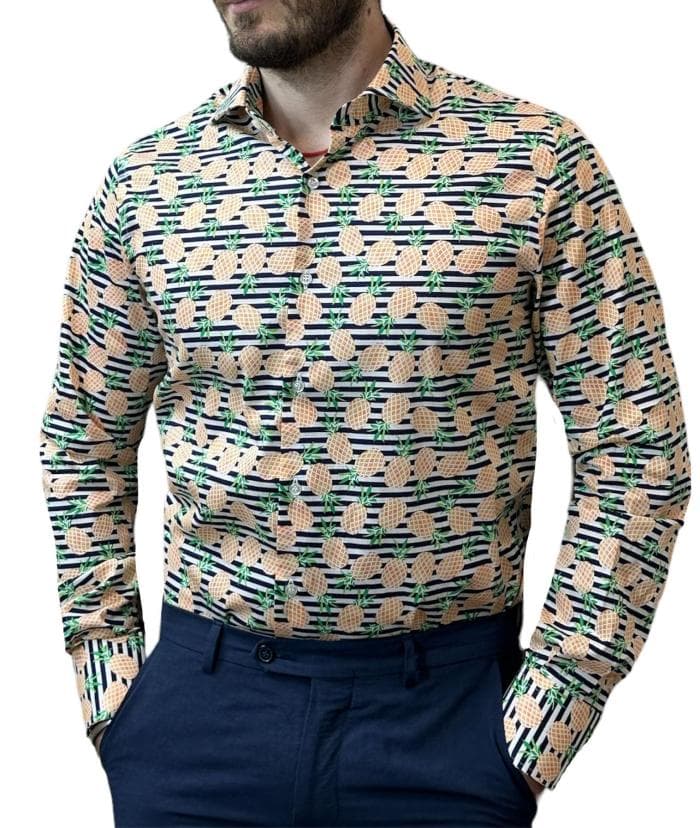 Scegli la qualità della nuova collezione di Camicia e Oltre per i tuoi look unici e originali. Camicia uomo a manica lunga in fantasia esotica su sfondo a righe bianche e nere. Realizzata in morbido puro cotone 100%. Colletto alla Francese. Stiro facile. Vestibilità Slim/Regular.