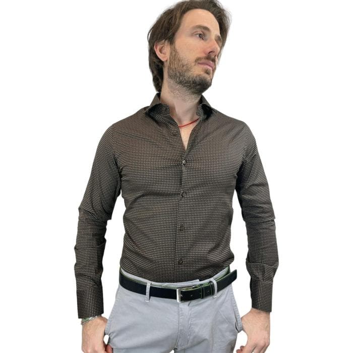 Camicia con fantasia su sfondo testa di moro in puro cotone. Estremamente versatile, perfetta da indossare su un pantalone casual, per un'occasione informale, o sotto una giacca per un outfit più ricercato. Colletto alla francese. Vestibilità Slim/Regular. Stiro facile.