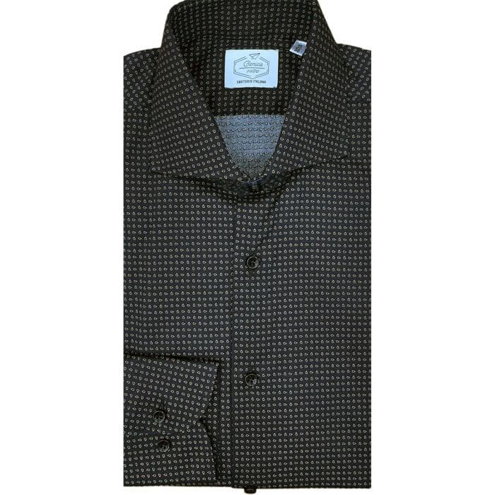 Camicia classica con microfantasia su sfondo nero, realizzata in puro cotone morbido al tatto. Indossala su un pantalone in cotone per un look più sofisticato, adatto a una serata speciale, oppure abbinala a un jeans per dare un tocco di eleganza al tuo outfit casual. Stiro facile. Vestibilità Slim/Regular.