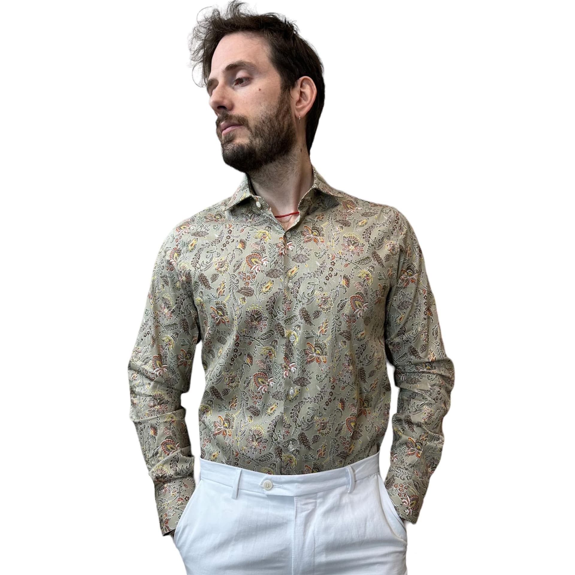 Rinnova il tuo look! Camicia uomo a maniche lunghe, con motivi floreali su sfondo beige. Realizzata in popeline di cotone leggero e resistente. Colletto alla Francese cucito a mano. Vestibilità Slim/Regular e stiro facile.