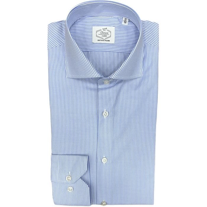 Camicia a righe strette celesti e bianche. Realizzata in morbido cotone 100% piacevole al tatto. Da indossare su un jeans per un outfit più casual o su un pantalone elegante per le occasioni più formali. Si adatta perfettamente alle forme del corpo. Elegante colletto alla francese cucito a mano. Vestibilità Slim/Regular. Stiro facile.