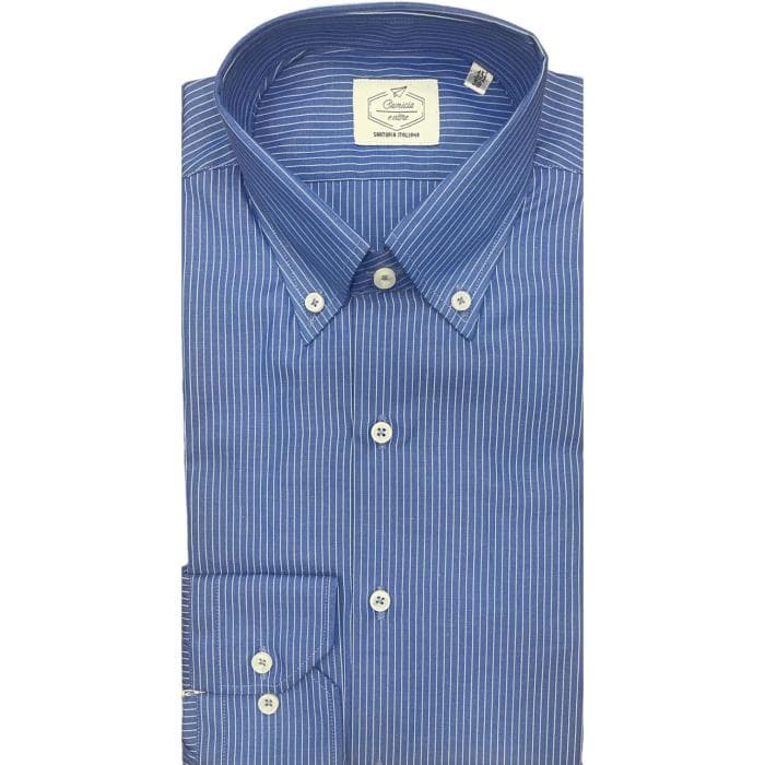 Camicia in puro cotone italiano con collo Button Down in fantasia rigata bianca su sfondo blu. Asole, colletto e bottoni cuciti a mano. Le nostre camicie vengono fatte secondo l'Antica Tradizione Napoletana nella fabbrica di famiglia. Facile stiro.