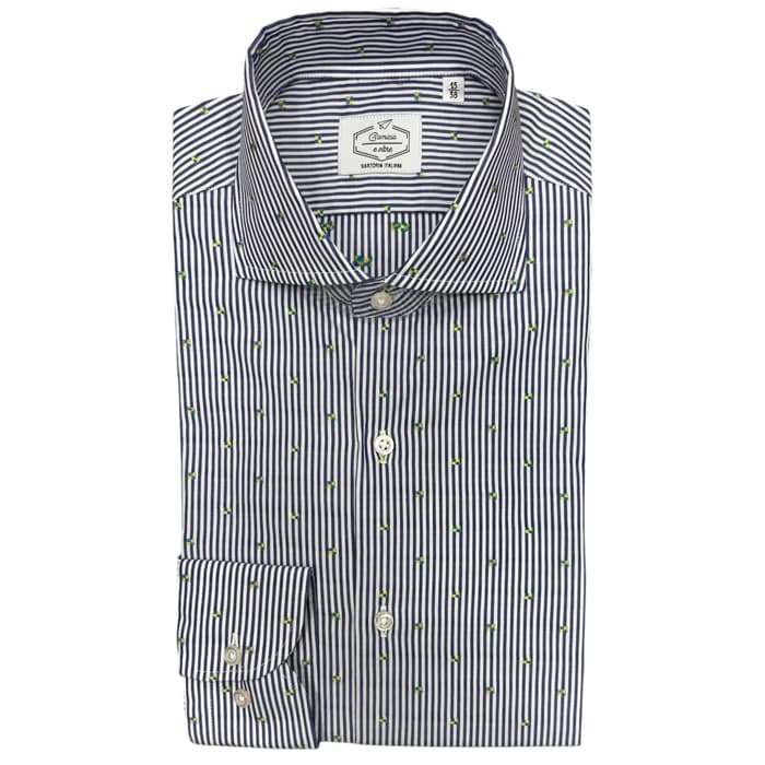 Camicia classica caratterizzata da una fantasia su sfondo Riga Blu e Bianco Realizzata in puro cotone 100%. Capo versatile, fresco e comodo, perfetto per l'ufficio. Ottima praticità grazie allo stiro facile e veloce. Colletto alla francese cucito a mano accuratamente. Vestibilità Slim/Regular.