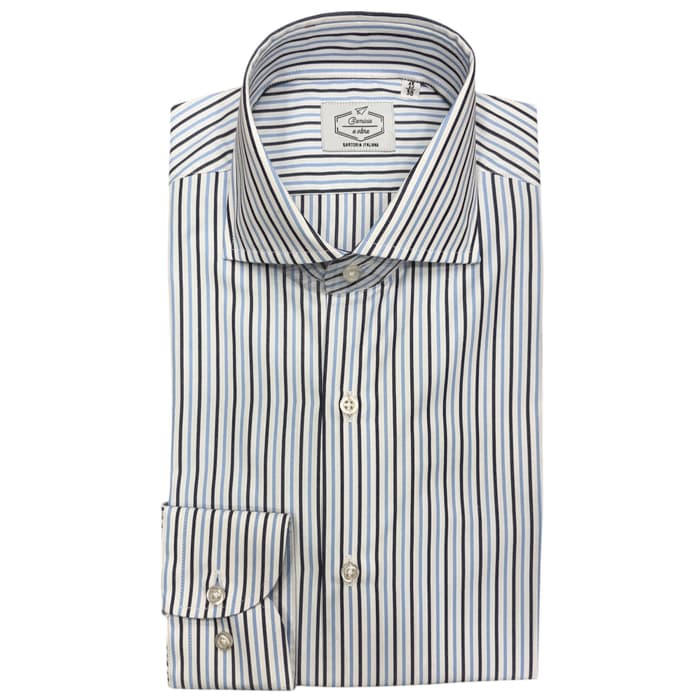 Camicia classica caratterizzata da una fantasia rigata multicolore, Realizzata in puro cotone 100%. Capo versatile, fresco e comodo, perfetto per l'ufficio. Ottima praticità grazie allo stiro facile e veloce. Colletto alla francese cucito a mano accuratamente. Vestibilità Slim/Regular.