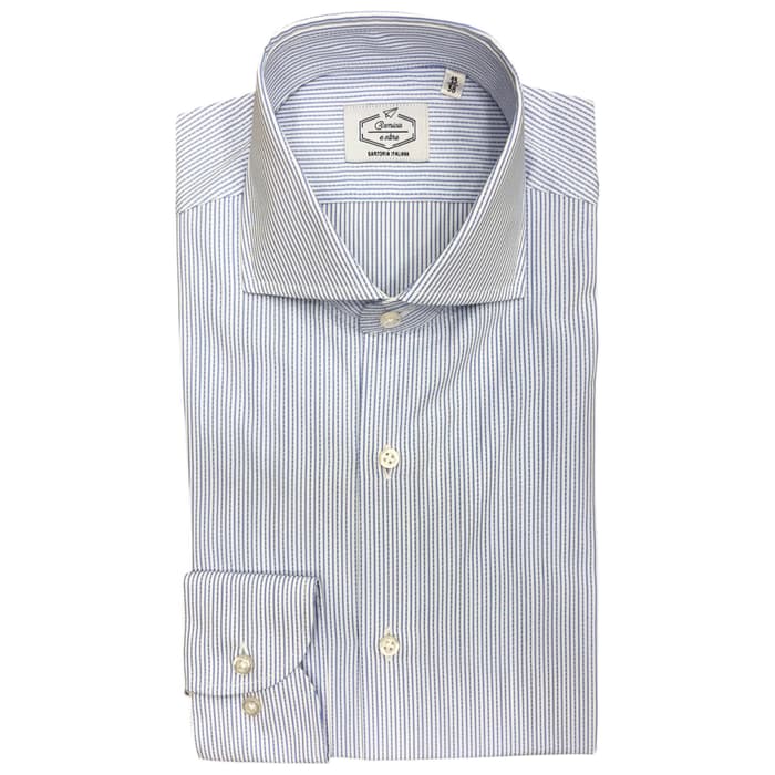 Camicia classica caratterizzata da una tramatura a righe bianche e celesti, Realizzata in puro cotone 100%. Capo versatile, fresco e comodo, perfetto per l'ufficio. Ottima praticità grazie allo stiro facile e veloce. Colletto alla francese cucito a mano accuratamente. Vestibilità Slim/Regular.