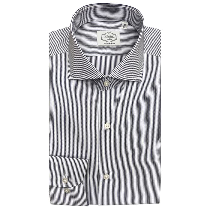 Camicia classica caratterizzata da una tramatura a righe Bianche e blu, Realizzata in puro cotone 100%. Capo versatile, fresco e comodo, perfetto per l'ufficio. Ottima praticità grazie allo stiro facile e veloce. Colletto alla francese cucito a mano accuratamente. Vestibilità Slim/Regular.