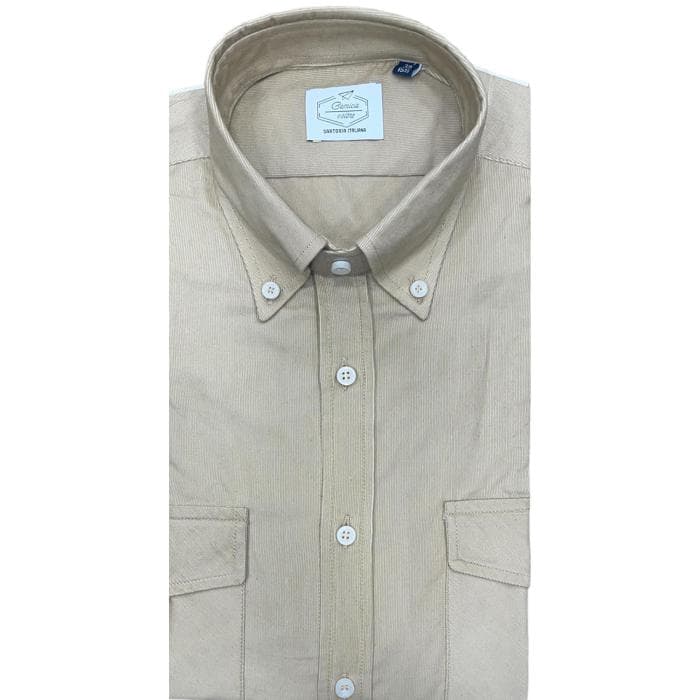 Camicia in puro cotone italiano con collo Button Down in tinta unita beige. Asole, colletto e bottoni cuciti a mano. Le nostre camicie vengono fatte secondo l'Antica Tradizione Napoletana nella fabbrica di famiglia. Facile stiro.