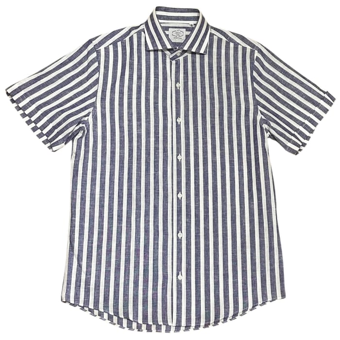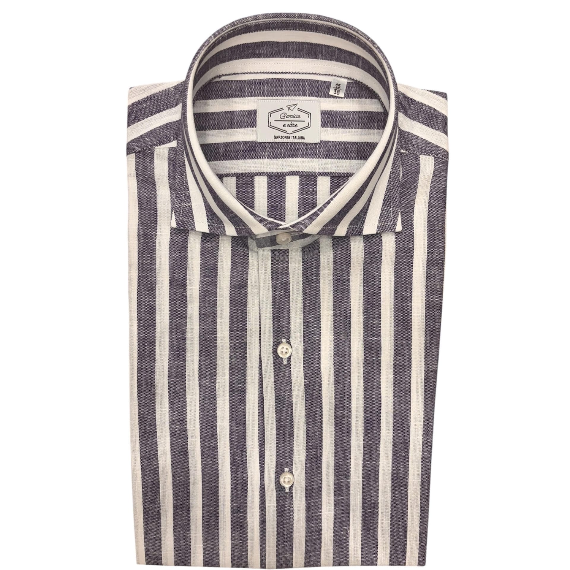 Camicia a righe Blu e Bianco da uomo in lino della collezione estiva di Camicia e Oltre. Realizzata in lino e cotone, un tessuto fresco e leggero adatto alla stagione estiva. Il colletto classico alla francese e le maniche corte rende questa camicia perfetta per le giornate estive. Fitting comodo grazie alla vestibilità Slim/Regular. Manica Corta. Stiro facile.