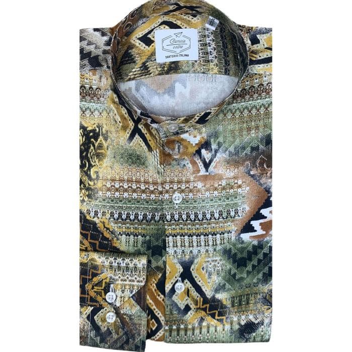 Scegli un capo fresco, morbido e colorato per la tua estate. Camicia uomo in fantasia etnica, realizzata in pura viscosa. Colletto alla coreana perfetto anche per i look più casual. Stiro facile. Vestibilità Slim/Regular.
