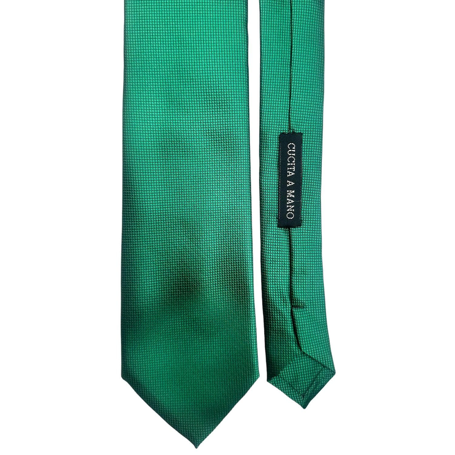 Cravatta in PET riciclato colore Verde Foresta. La tinta unita e la trama diamantata rendono questa cravatta un accessorio versatile, ideale per aggiunge un tocco di colore ai tuoi outfit più eleganti. Larghezza pala, disponibile da 5 cm o 8 cm. Realizzata a mano secondo l'Antica Tradizione Sartoriale Napoletana.