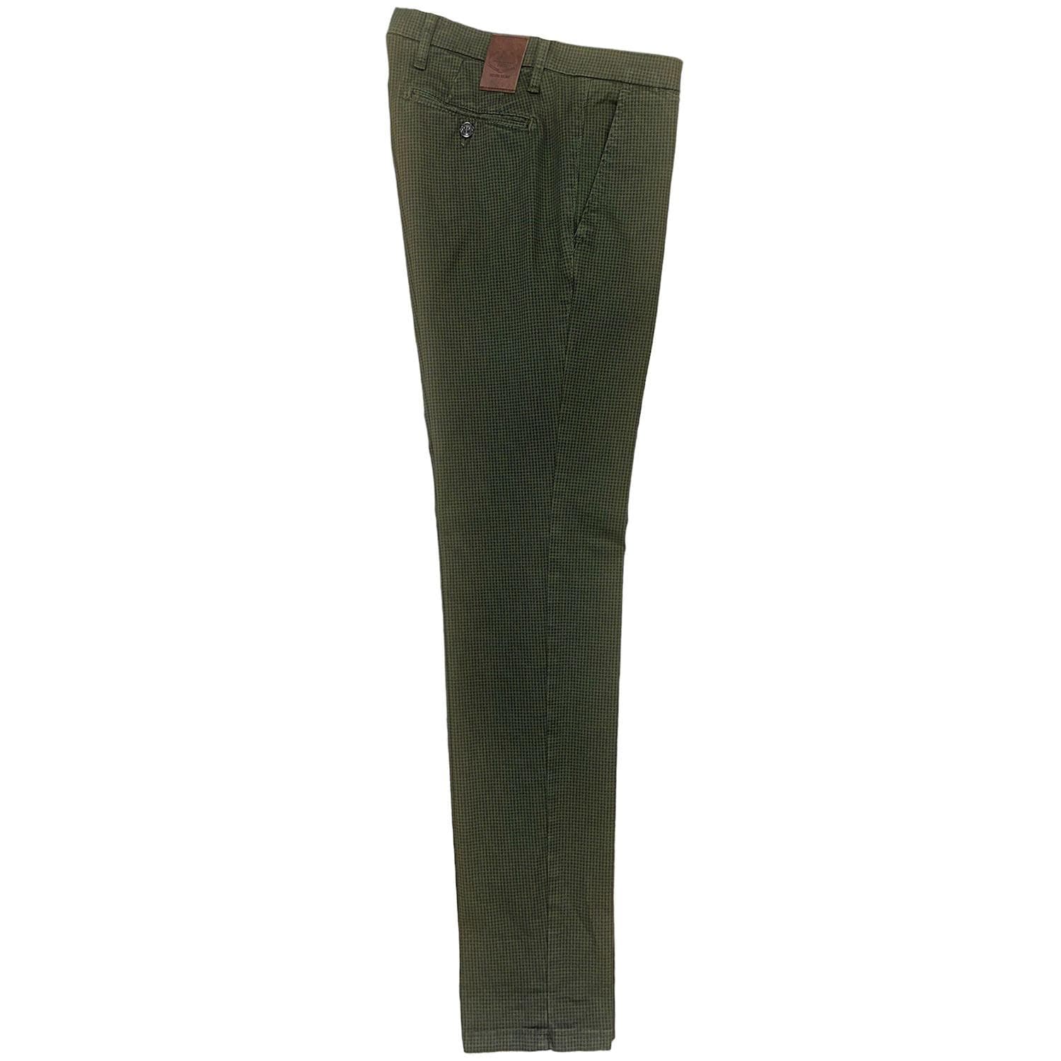 Alla ricerca di comfort e stile nelle giornate più fredde? Pantaloni da uomo in cotone caldo con fantasia Pied Pule. Colore verde militare. Due tasche laterali e due tasche posteriori con chiusura a bottone. Indossalo con un maglioncino per un look più casual o abbinato a una giacca per un look più ricercato.
